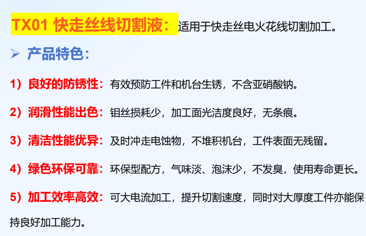 环保型配方,不发臭,使用寿命更长; 产品清洁性能好,加工面不易发黏; 放电火花活跃,加工效率高,可加工厚件; 润滑出色,钼丝损耗少,加工面的光洁度良好,无条痕; 防锈良好,气味淡,泡沫较少,维持良好的加工环境。