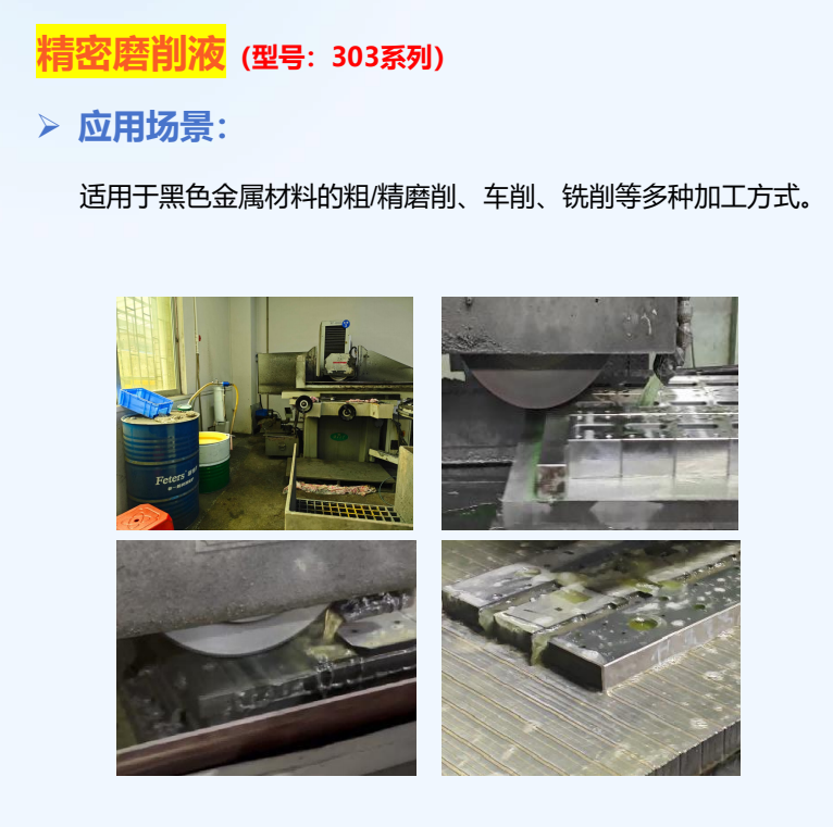 适用于碳钢、合金钢、铸铁等黑色金属材料的粗/精磨削、车削、铣削等多种加工方式。可用于单机和中央冷却系统。