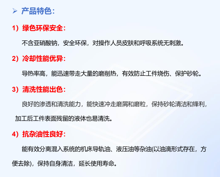 2、优异的湿润性和清洗性,能保持刀具及砂轮的清洁;